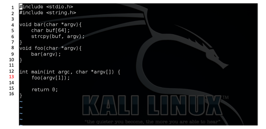 buf.c 코드를 보면 13번째 줄에서 foo() 함수를 호출합니다. 따라서 breakpoint로 13번째 줄을 지정합니다.