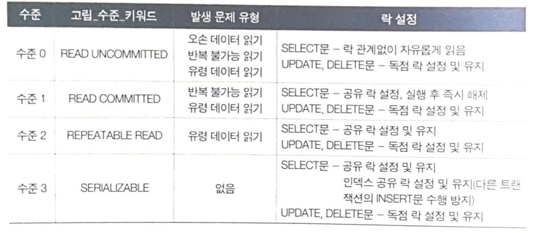 - 또, 설정된 락은 SQL 명령문 실행 직후가 아닌 트랜잭션 커밋 혹은 롤백이 실행됨과 동시에 해제해야 함