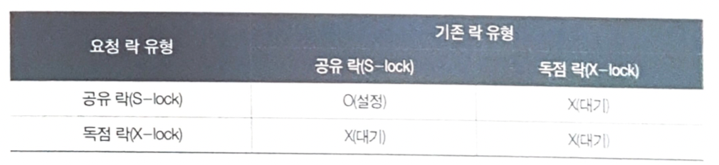 - 독점 락과 공유 락 2가지 유형의 락 사이에는 서로 추가 잠금 허용 여부를 결정하는 락 양립성(lock compatability) 규칙이 있음
