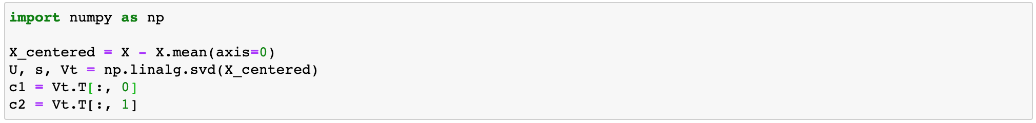 여기서 V가 주성분의 단위 벡터가 된다. 이후 주성분 벡터에 데이터 행렬 X를 행렬 곱셈하면 축소된 데이터를 얻는다.