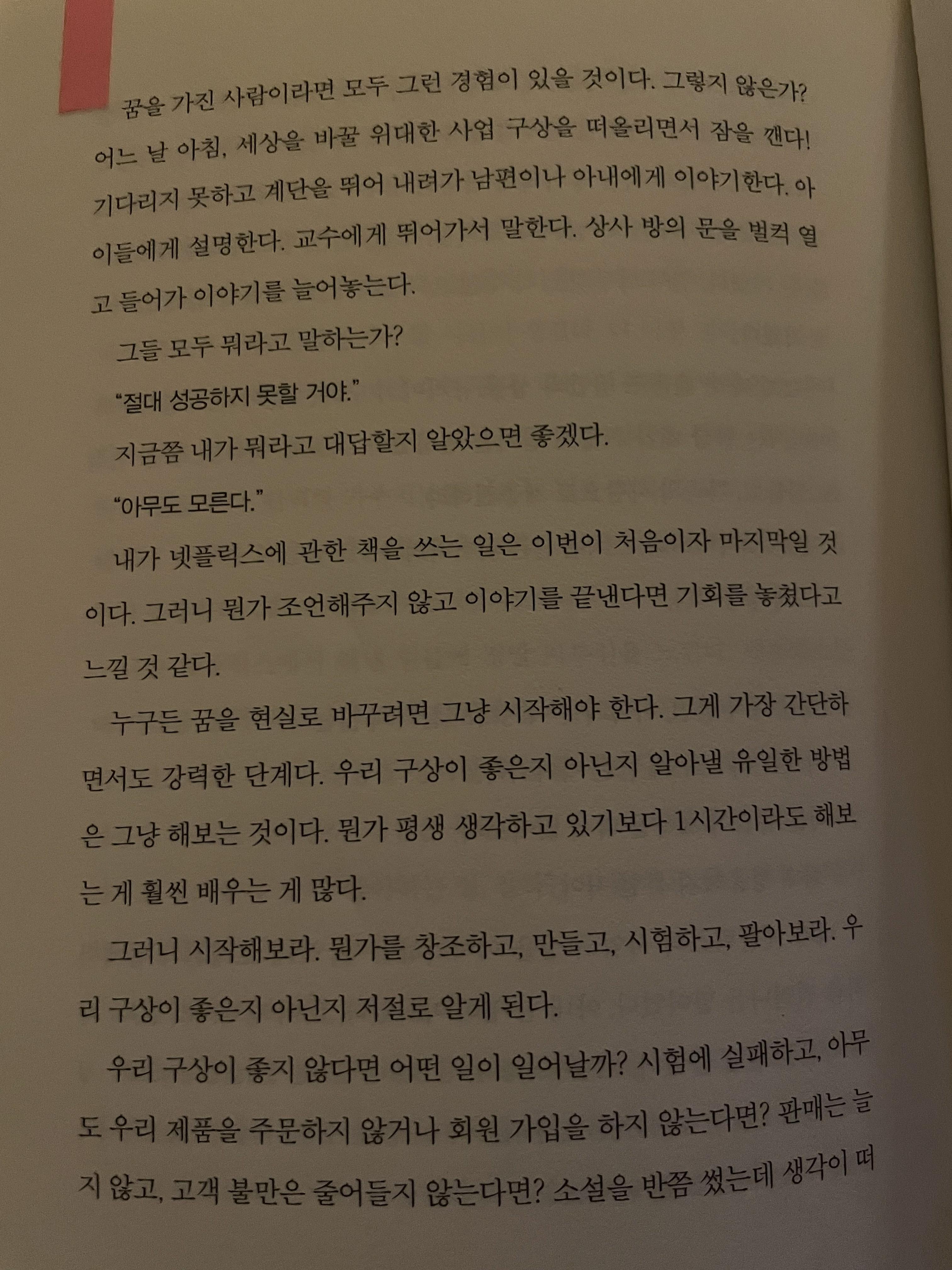 이런 종류의 서적들의 문체가 대개 담담한 회고록처럼 쓰여 있다. 그니까, 저자가 갑자기 이야기를 들려주다 말고 독자에게 이런 저런 메시지를 전하는 경우가 흔하지 않고, 그렇다하더라도 무미건조한 응원처럼 적어놓는 경우가 많다. 반면 저자는 반복해서 "진짜다." "내 말을 믿어라." 이런 식으로 말한다. 넷플릭스 설립자라고 전지전능하지도, 실수하지 않는 기계도 아니지만 책 전반을 감싸고 있는 솔직함과 열정을 느껴본 독자라면 저자의 이런 저런 말들이 굉장히 설득력있게 들릴 것이다.